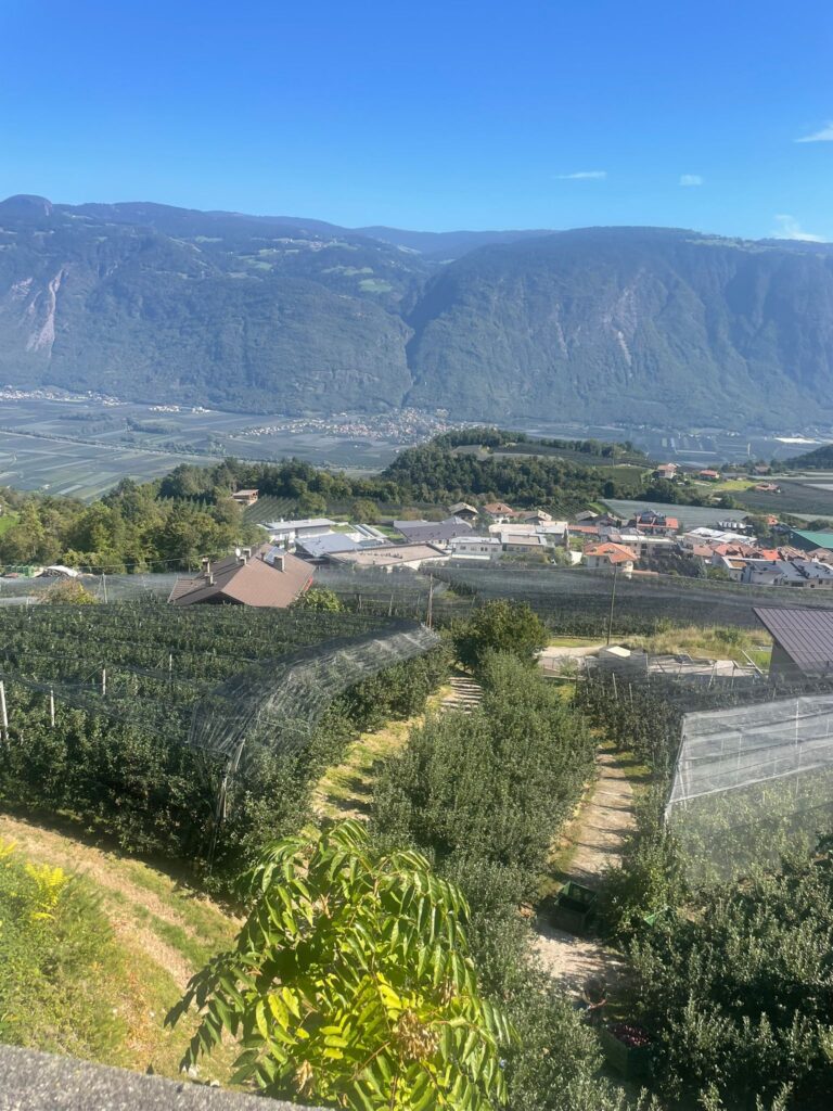 Los ging es dann mit unsere Radtour von Kaltern aus über einen Radweg nach Eppan weiter an Obstplantagen und Weinreben vorbei nach Lana. Es ist momentan Hochsaison für die Ernte der Obst- und Weinbauern in Südtirol. Reges treiben überall auf den Feldern, wo die Äpfel und Trauben geerntet werden. Südtirol ist das größte zusammenhängende Apfelanbaugebiet Europas. Im Norden durch die Alpen geschützt, nach Süden hin geöffnet, bietet die Region ideale Bedingungen für den Apfelanbau. Seit über hundert Jahren bauen Bauern in Südtirol Äpfel an. Jeder zweite Apfel Italiens und jeder zehnte Europas wächst hier.